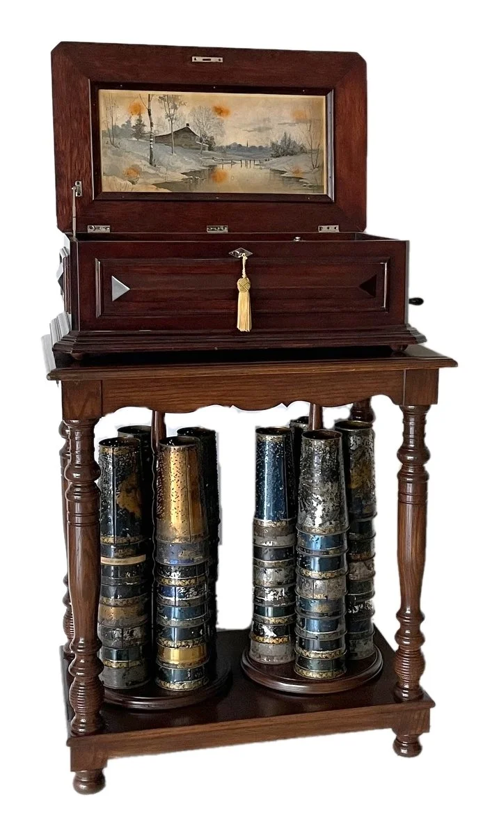 Perhaps the most unique music box ever created, with an intriguing backstory, dating to the early 1890’s. At that time, Polyphon Musikwerke of Germany decided to manufacture music boxes in the U.S., as the import duties then in place were limiting their sales. They sent Gustave Brackhausen to America with a mandate to begin manufacturing as soon as possible. Brackhausen set up shop in New Jersey and initially manufactured to Polyphon’s designs, and quickly moving to newer more “Americanized” designs, which became the Regina lineup.