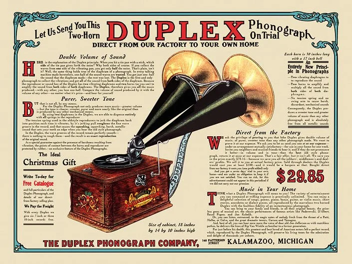 A beautiful Duplex, made over 100 years ago for mail-order sales, an offering the unique dual-horn setup, promising extraordinary sound volume and clarity. Fully restored and looking as great as it plays. These rare and unusual phonographs are favorites of collectors worldwide!