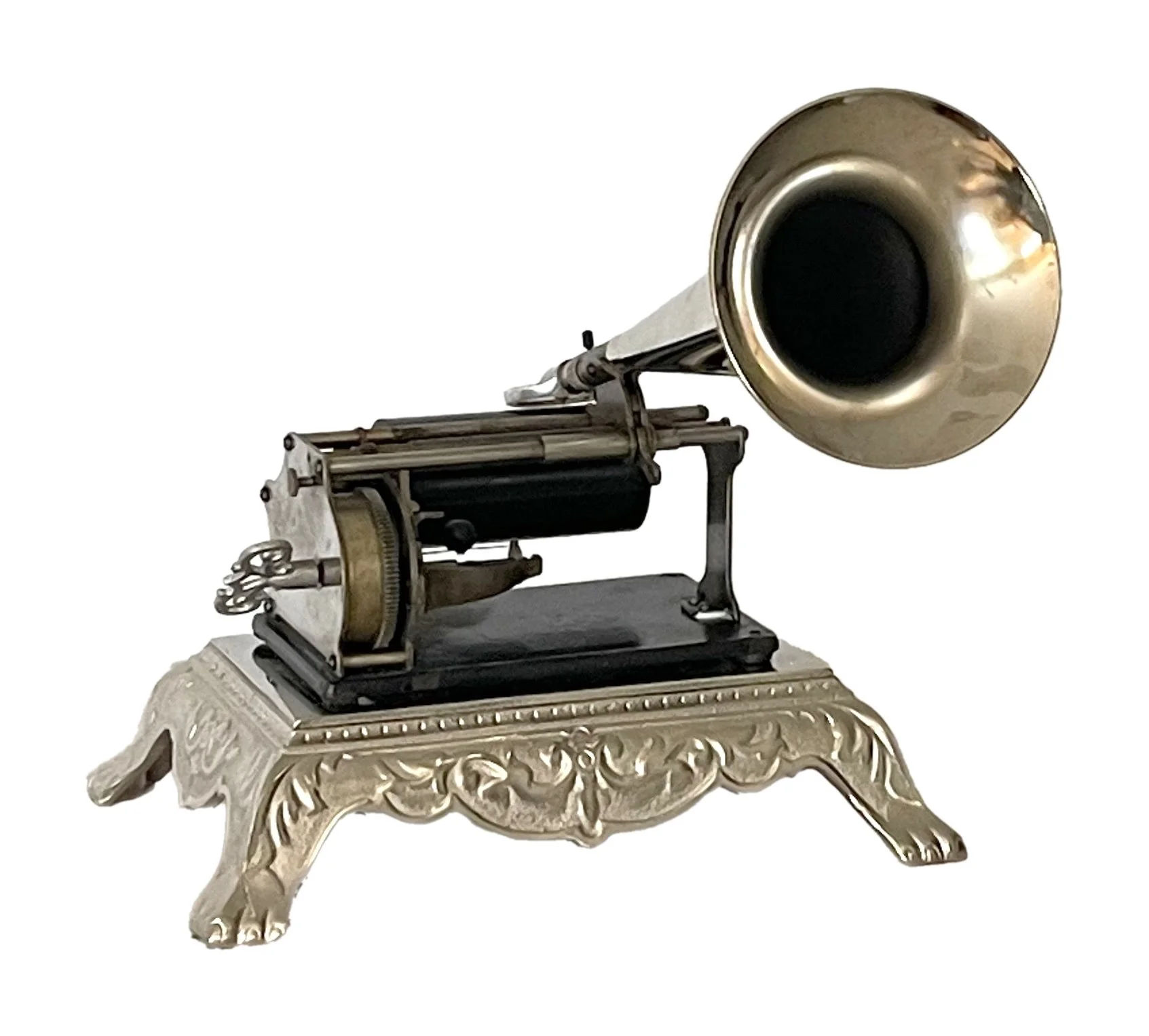 A nice, early Q, playing 2-minute cylinders very well. The horn, winding key and fancy base are modern replicas.