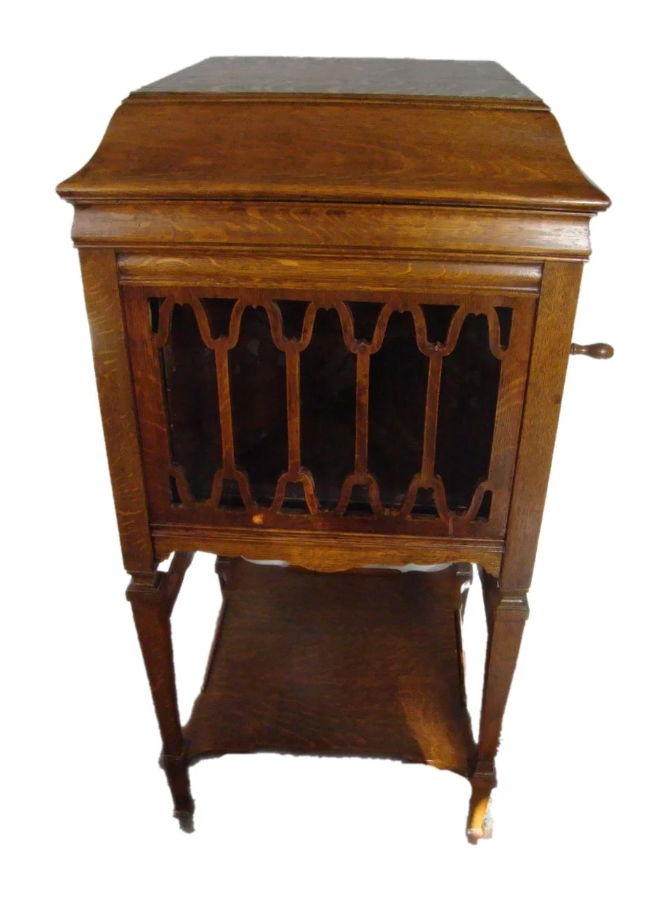 Oak and mahogany versions have slightly different cabinet hardware; mahogany versions have lifting handles but no lid latches.